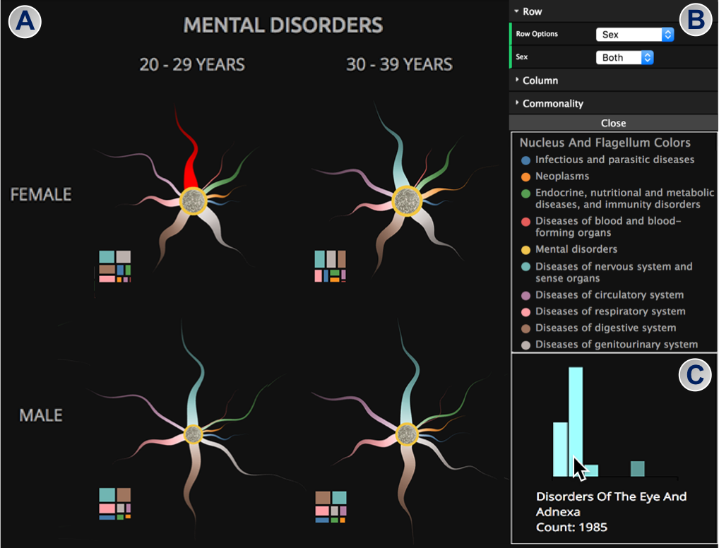 Example of given (A) patients that have mental disorders we can see several visualizations show what disease co-occur, in this case we select for Females 20-29 and examine disease of the nervous system and sense organs. We find in (C) that the most common diseases of nervous and sense also have disorders of the eye.